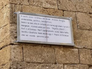 “In questo vicolo il 2 gennaio 1896 nacque Accursio Miraglia, sindacalista, politico, benefattore. Dedicò la sua vita ai contadini, ai marinai, agli orfani e a tutti i bisognosi rivendicando per loro Dignità e Diritti. Morì il 4 gennaio 1947 barbaramente ucciso dalla mafia. Verità e Giustizia chiede ancora oggi il Popolo di Sciacca che nel ricordo perenne pose“.