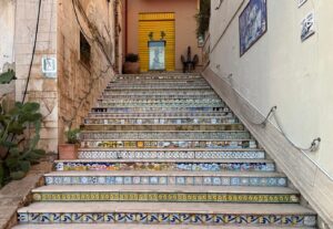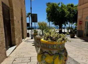 Non passa inosservata. Appena entri in città è una festa di colori, una festa di ceramica. La vedi sui muri, la vedi lungo le scalinate, la vedi lungo le vie principali e i vicoli e le piazze del centro storico nelle tante botteghe che la espongono in vetrina, nelle pareti d’ingresso, ma anche fuori sui marciapiedi dove pure, nella stagione estiva, trovi i suoi autori modellare o dipingere al tornio, piatti, vasi, statuette, mattonelle e altro.